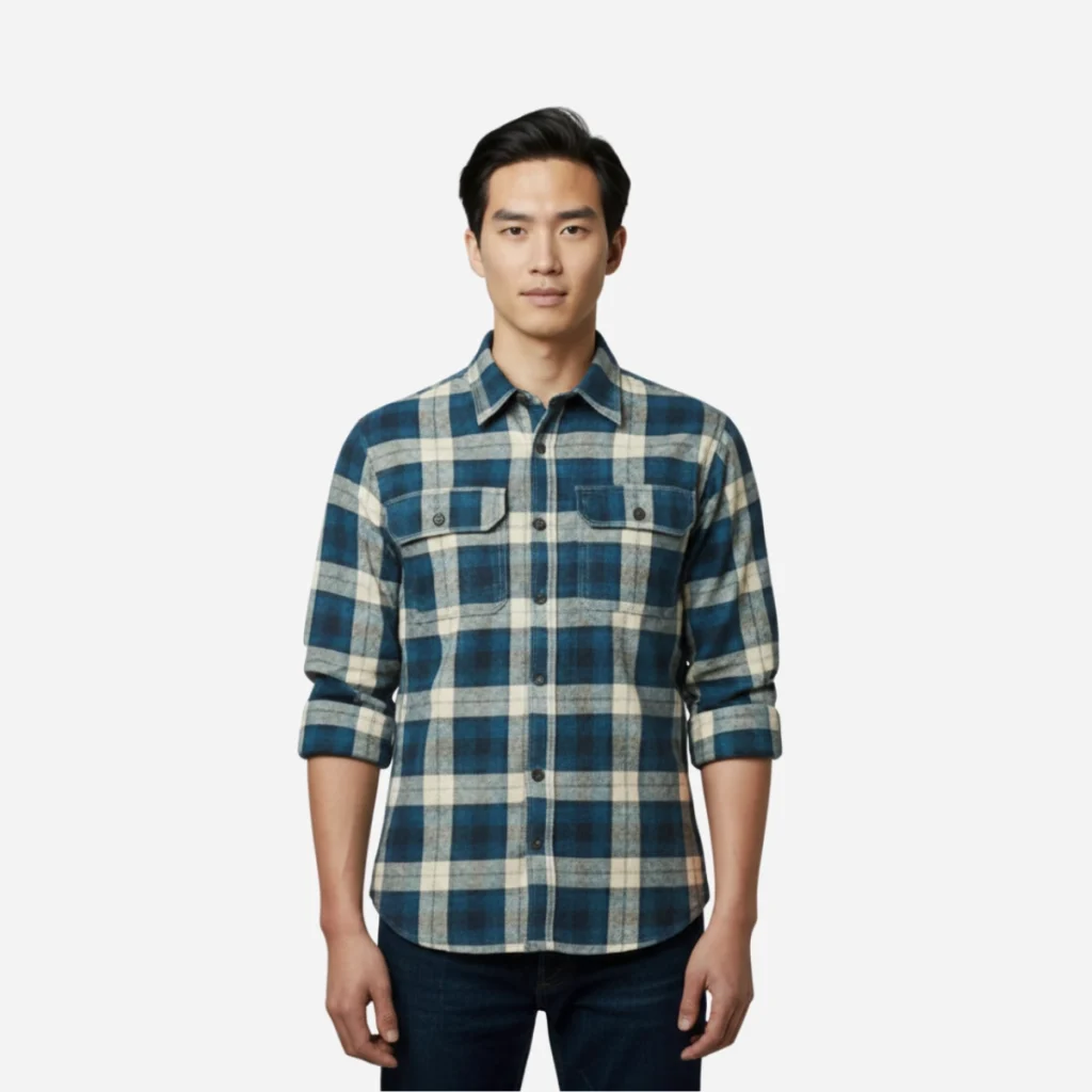 A soft, durable blue-and-cream plaid flannel with dual chest pockets—perfect for layering or laid-back daily wear. A timeless staple for every modern wardrobe.